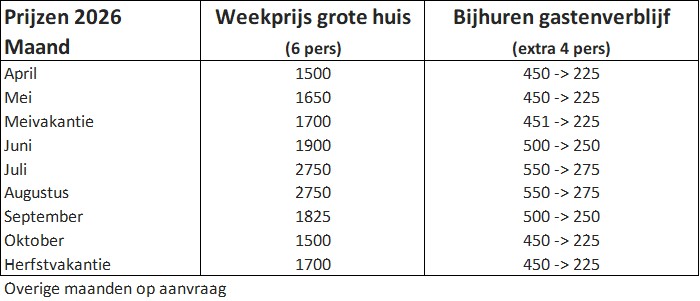 Verhuurprijzen 2026 per week in €