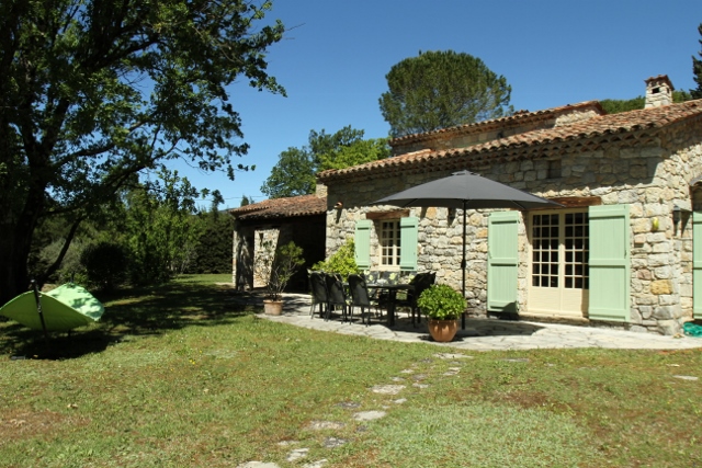 Voor het huis is een terras met gazon. Er zijn diverse tuinsets voor op het terras, het gras en onder de auvent (overdekt terras). Overdag geeft de grote eik voor het huis heerlijk schaduw op een warme dag, ’s avonds is het aangenaam vertoeven onder de auvent met elektrische terrasverwarmers.